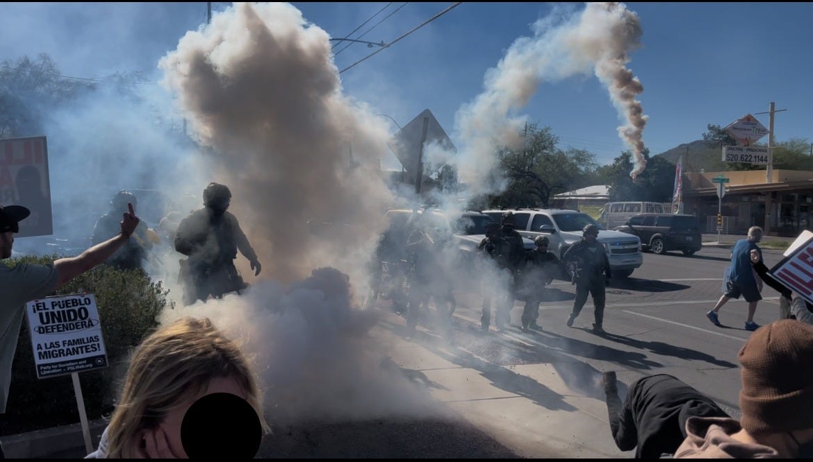 A little while later, community members gathered at one of ICE’s Tucson field offices. ICE officers stormed them there as well, allegedly pepper-spraying people through a fence.